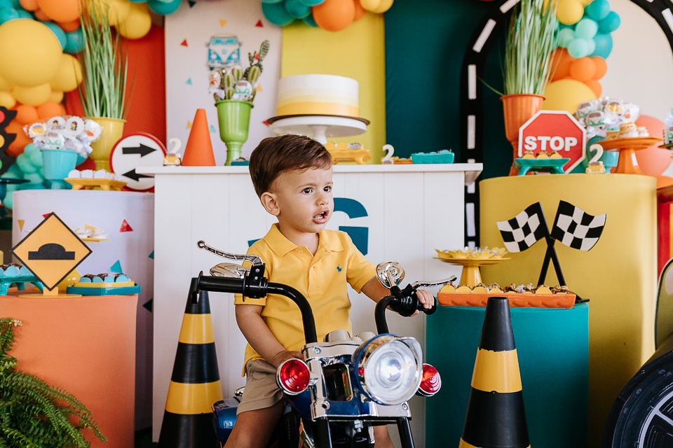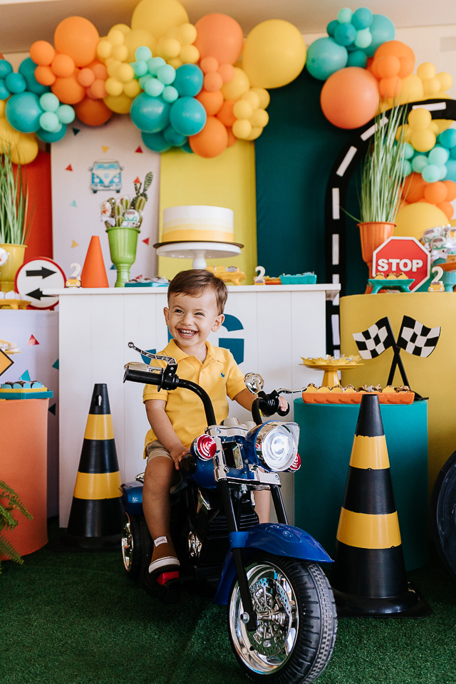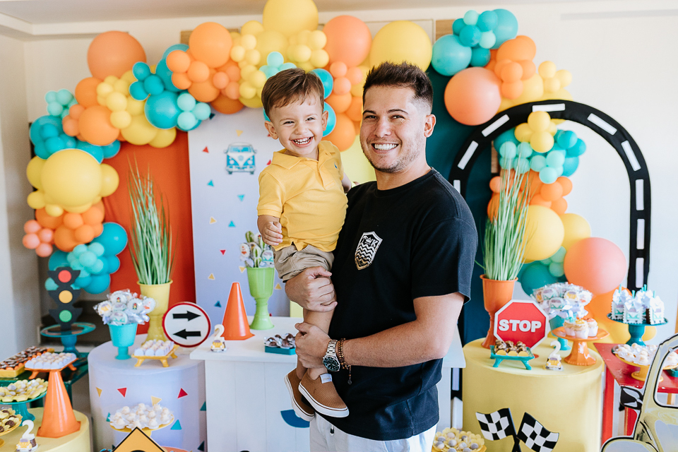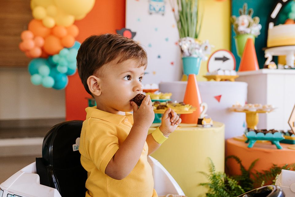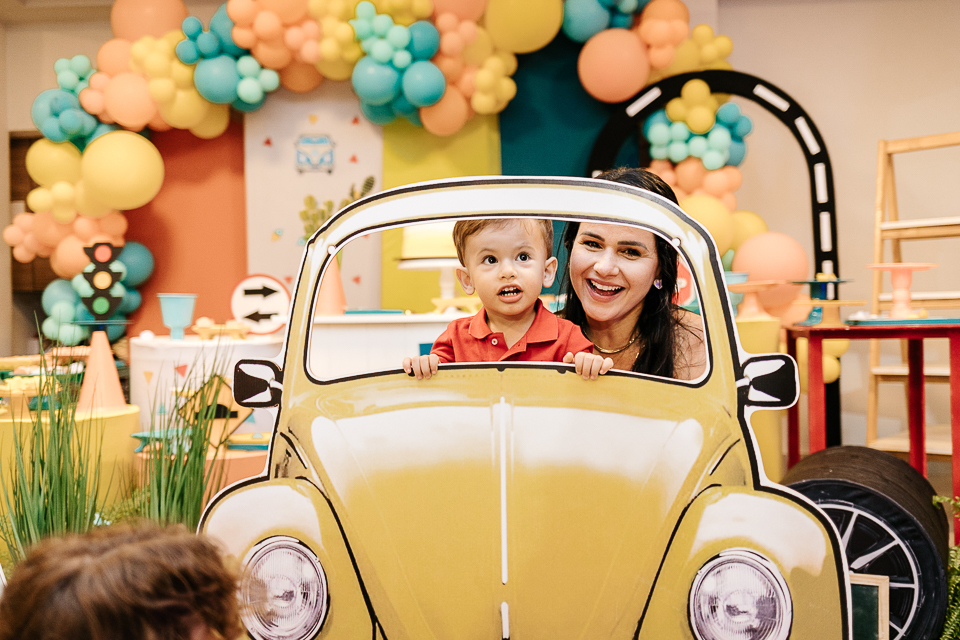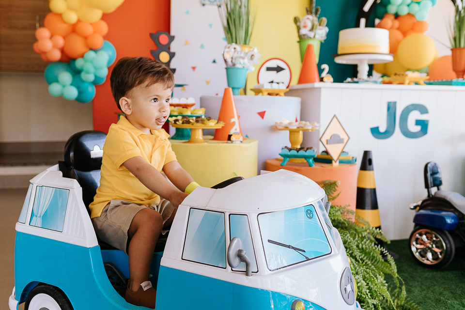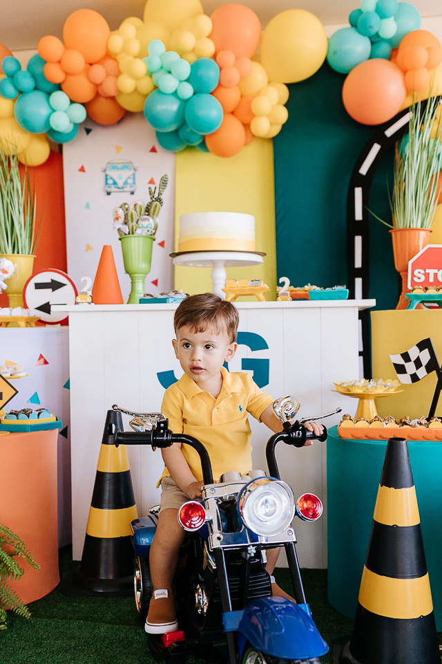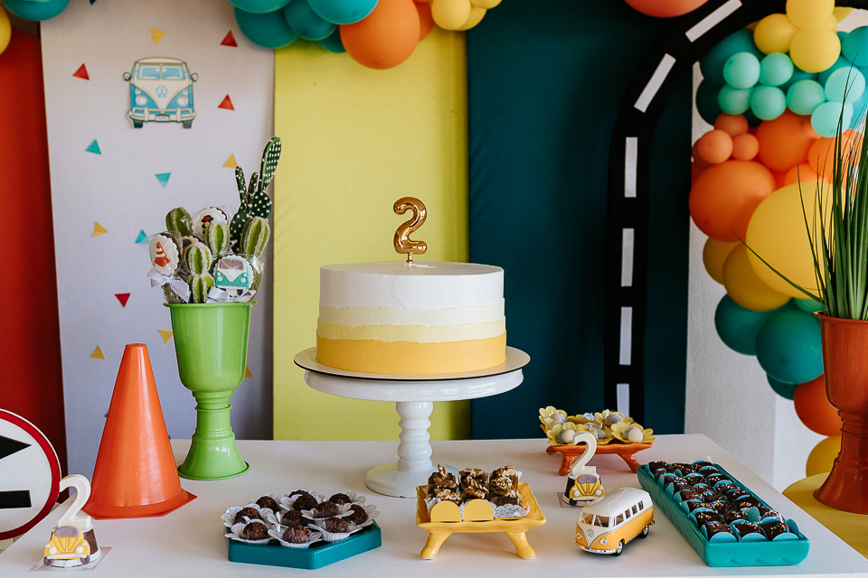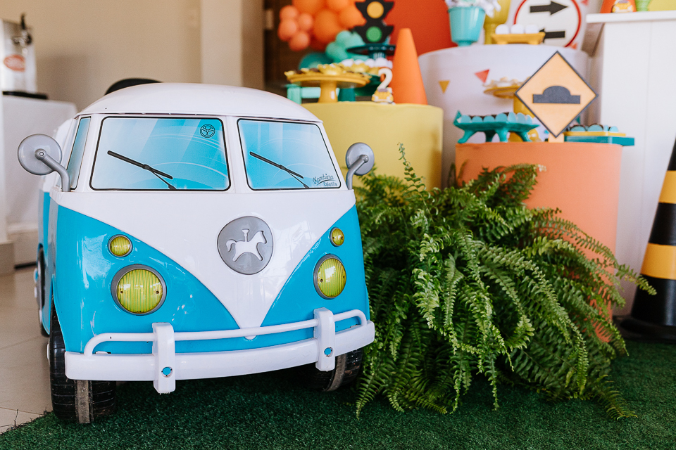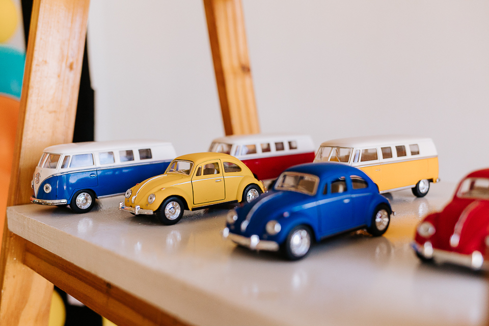 Com o tema fusca e kombi, que o pequeno ama, a decoração trouxe uma paleta bem interessante e uma nostalgia típica, mesmo para quem é tão pequeno ainda...