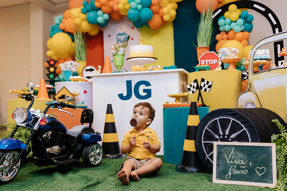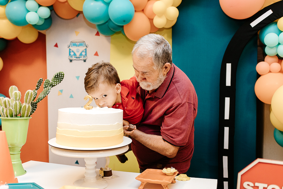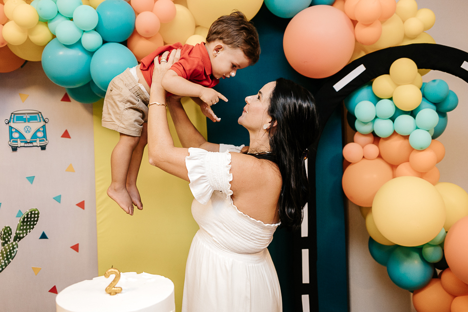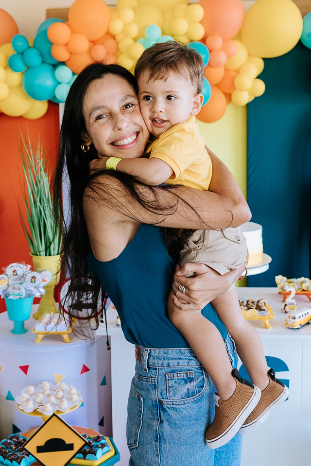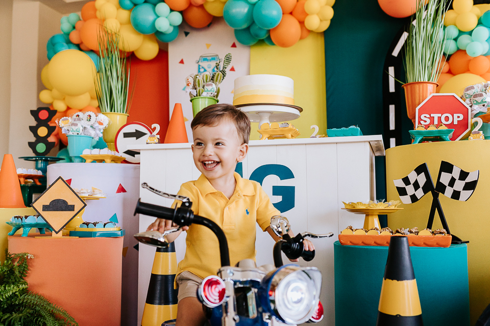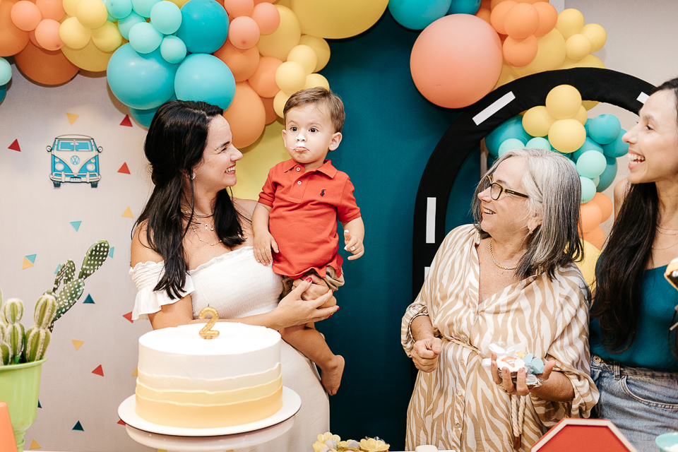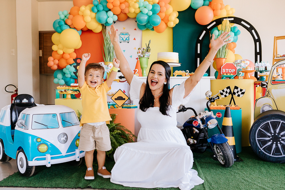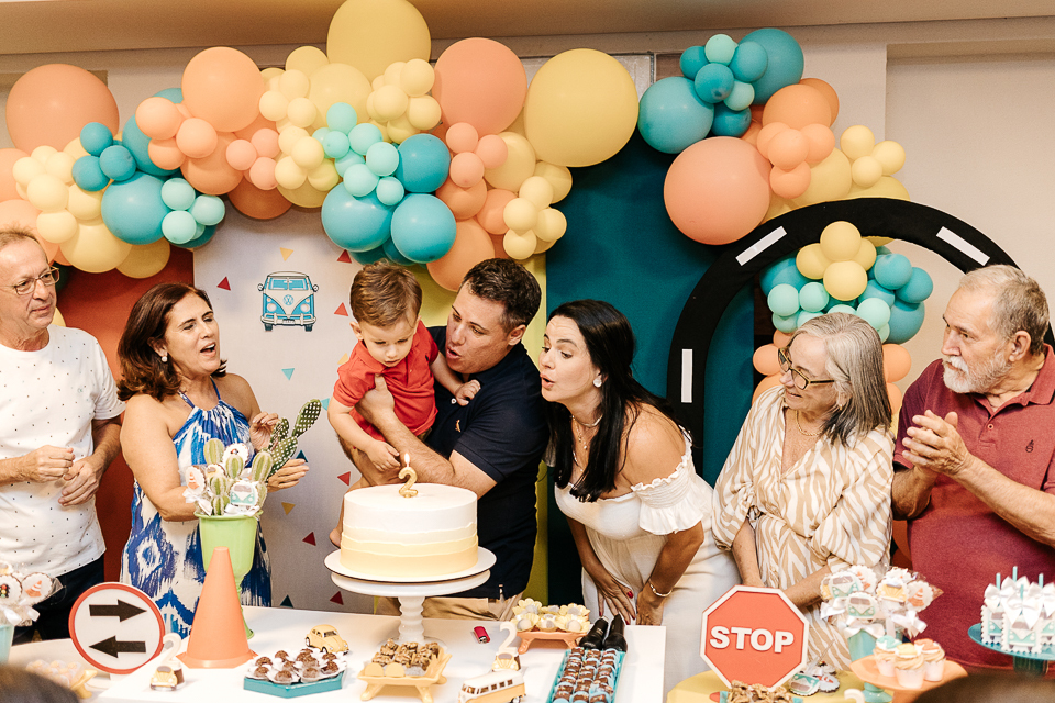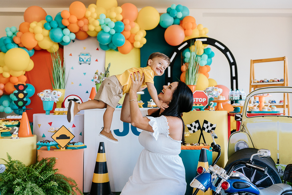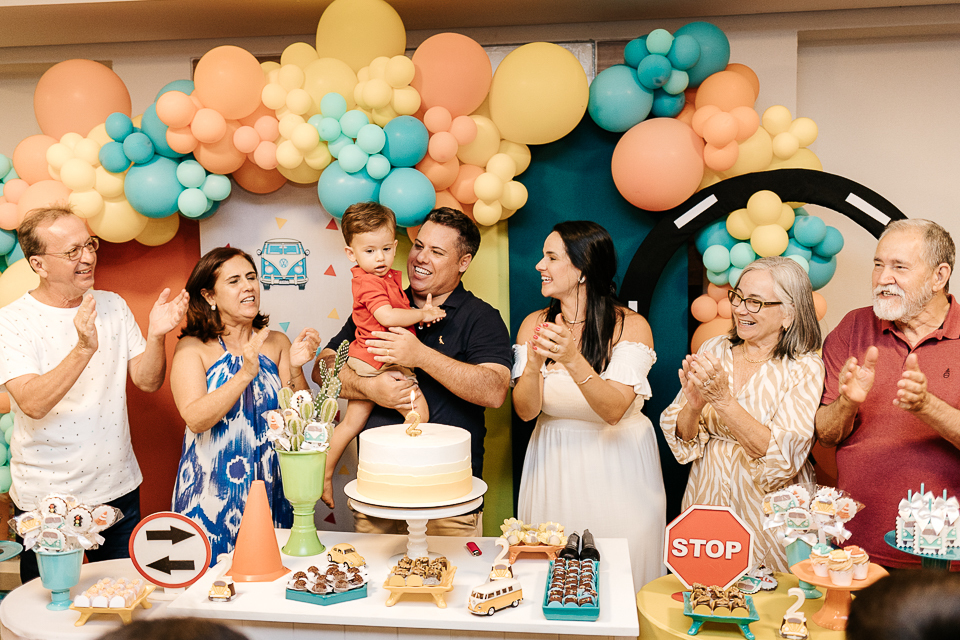 Com o tema fusca e kombi, que o pequeno ama, a decoração trouxe uma paleta bem interessante e uma nostalgia típica, mesmo para quem é tão pequeno ainda...