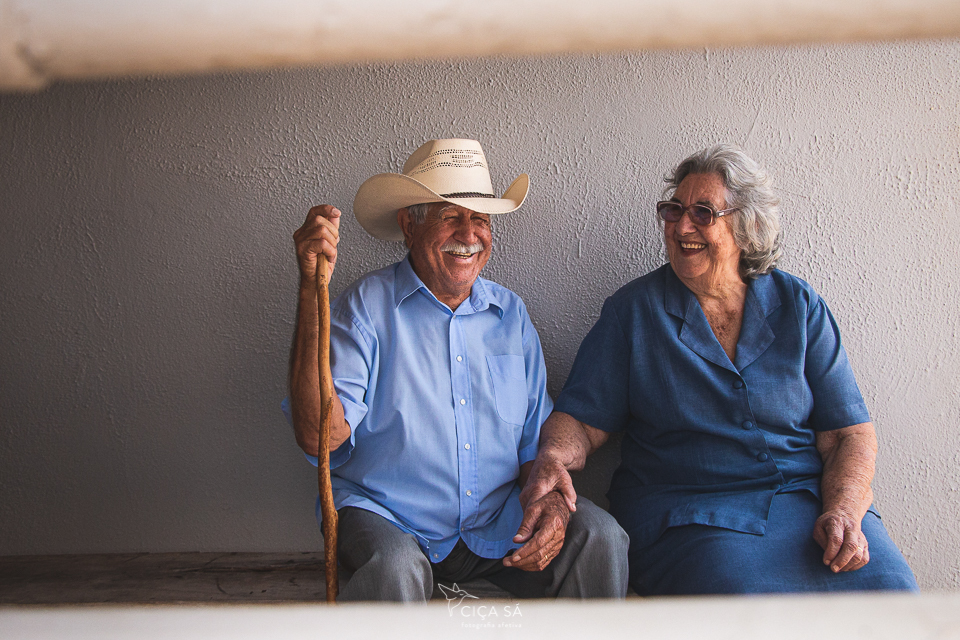 O Sr. Jó e a D. Maria completam, em dezembro, 60 anos de casamento. Bodas de Diamante. Fui na casa deles para os conhecer melhor pessoalmente e bater um papo e logo vi que ali tinha história. Evidente que sim, né? Afinal, sessenta anos de convivência é pano pra manga. Onze filhos, dezessete netos, sete bisnetos, casos e casos para contar e recontar e contar de novo. Aliás, Jó é um exímio contador de casos, tem uma memória inacreditável, bom humor e perspicácia admiráveis. Sua companheira de vida, Vitória, é só sorrisos e uma bondade que transborda e faz brotar flores e plantas medicinais em seu quintal. Apaixonaram-se jovens, casaram-se escondido, foram pra roça montados no cavalo, criaram seus filhos. Muito trabalho, muita luta, muito amor!