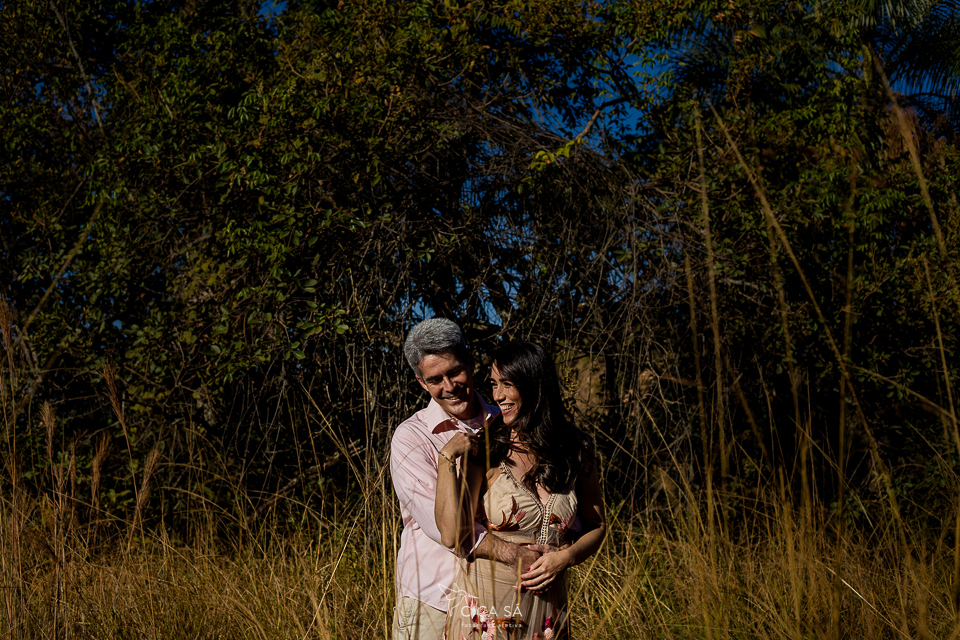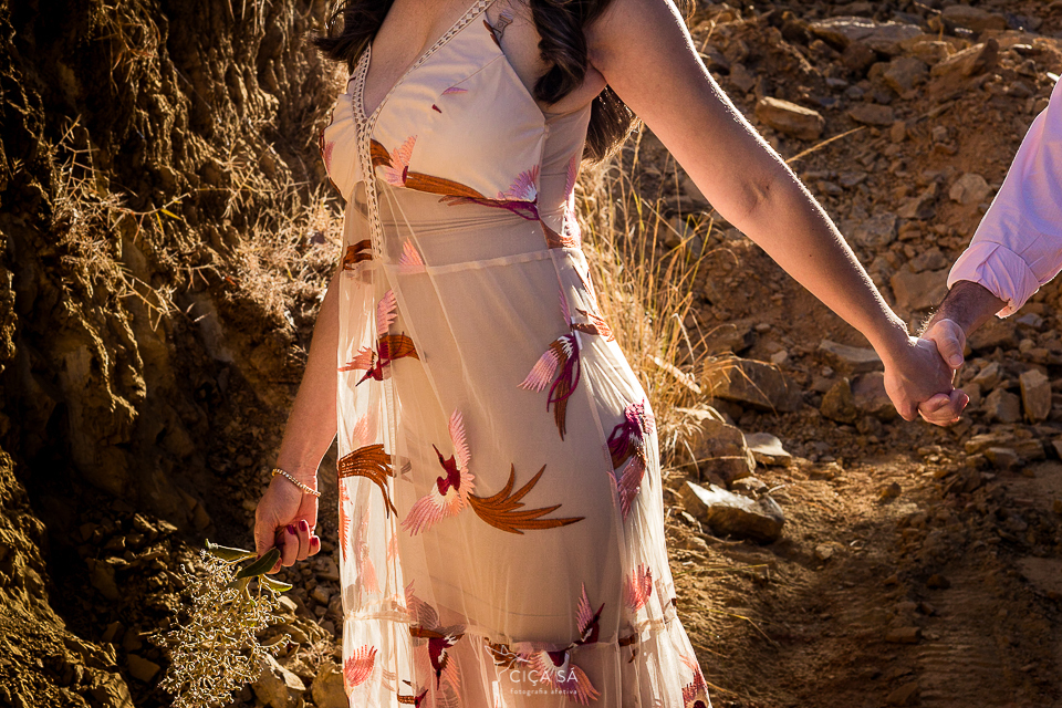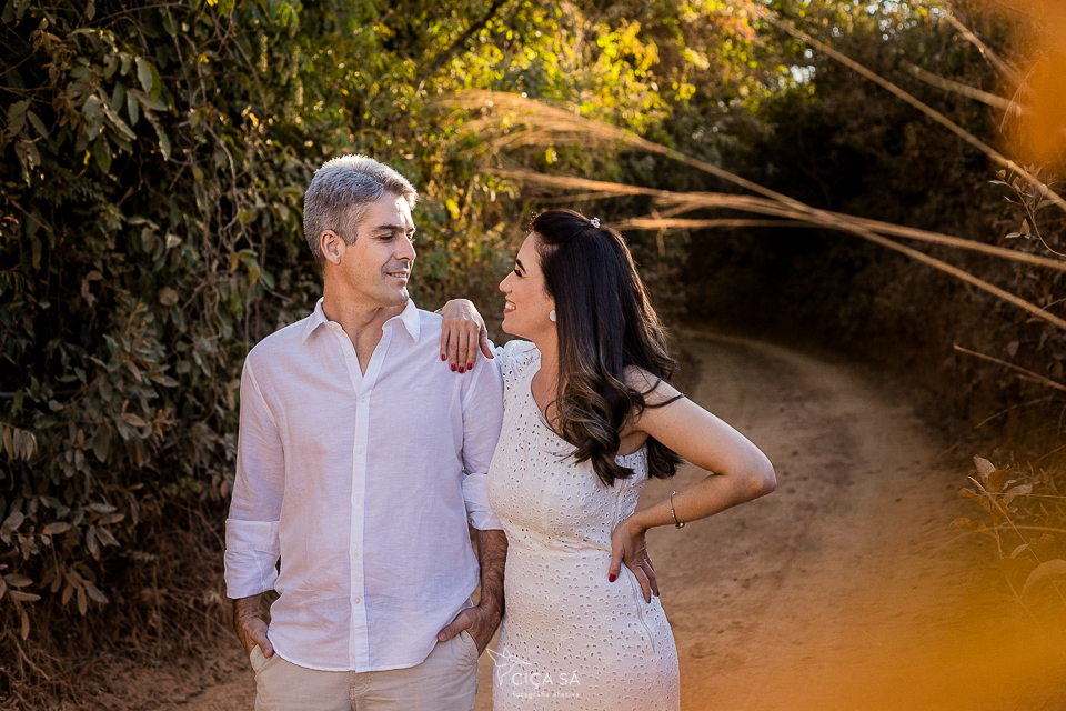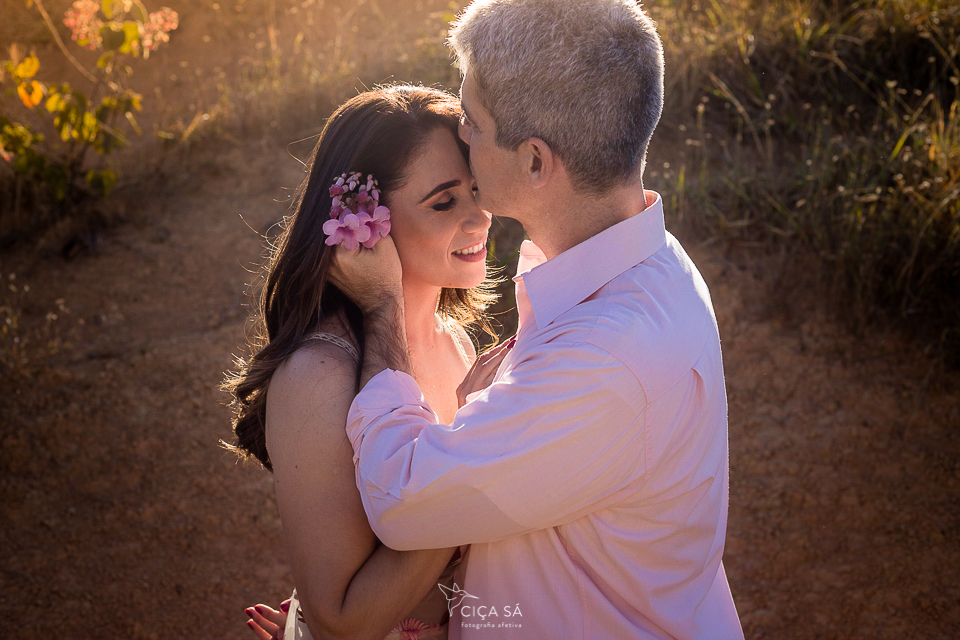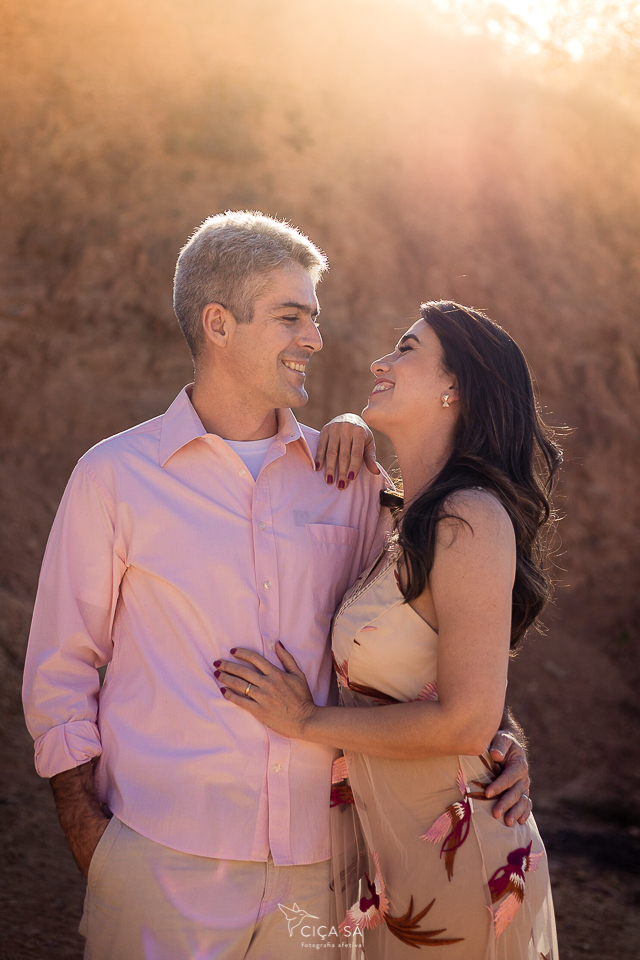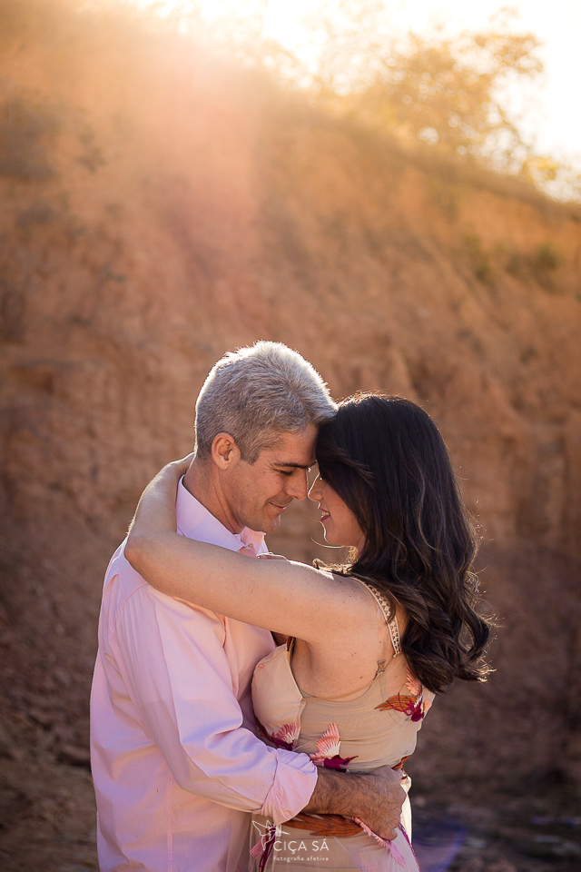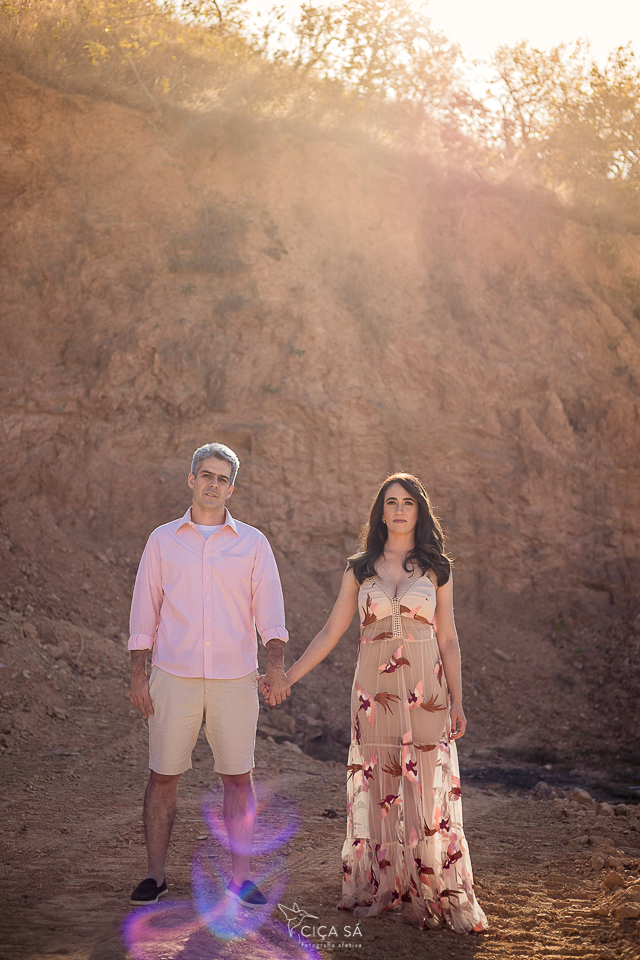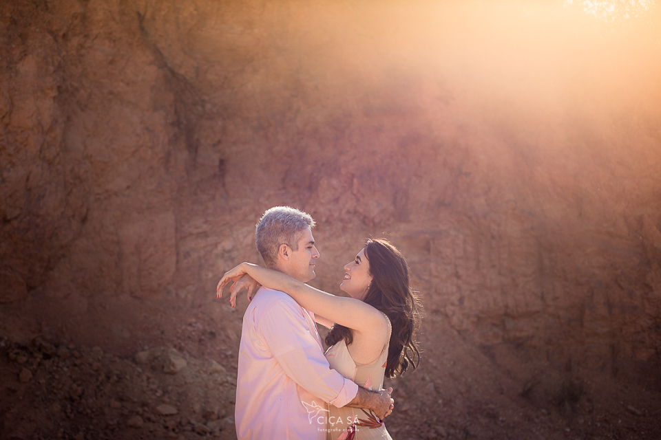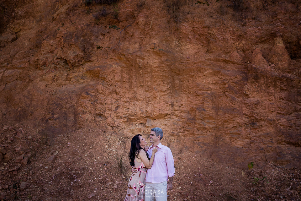 E aí, tendo ela visto um dos últimos ensaios de casal feitos lá nos túneis de Serra da Saudade, se apaixonou perdidamente pelo lugar, pela luz de lá e pela vibe das fotos! Ensaio devidamente agendado, rumamos pra Serra. Mas, eis que, ao chegar lá, cadê túneis? A gente se deparou com uma montanha de pedras que impedia que seguíssemos pela estradinha de terra, já bem próximos dos benditos túneis... Escalar não seria uma opção e, donos de um astral incrivelmente bom e desapegados de planos e expectativas, Débora e André toparam fazer as fotos ali mesmo, no gigante barranco de terra rosada, pelas redondezas, na estradinha, no meio do mato, onde tivesse a luz mágica que você vê nessas fotos...