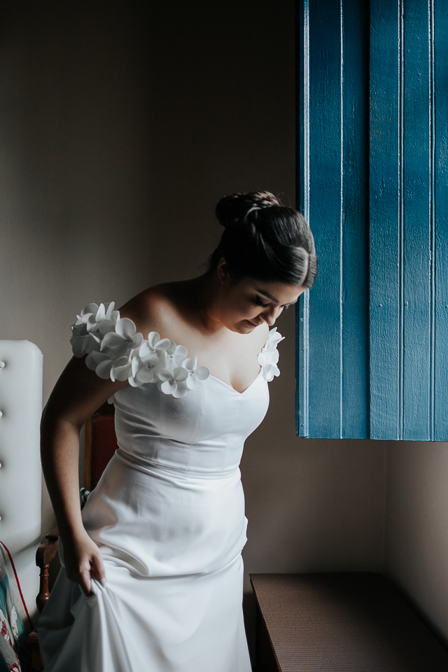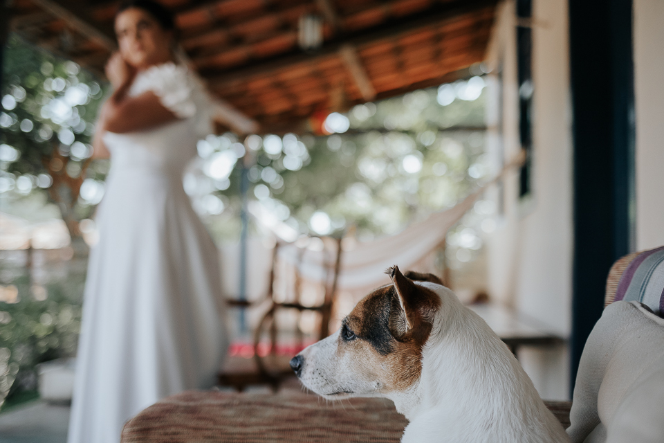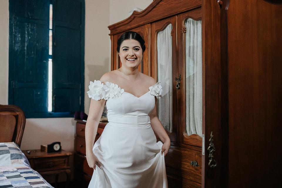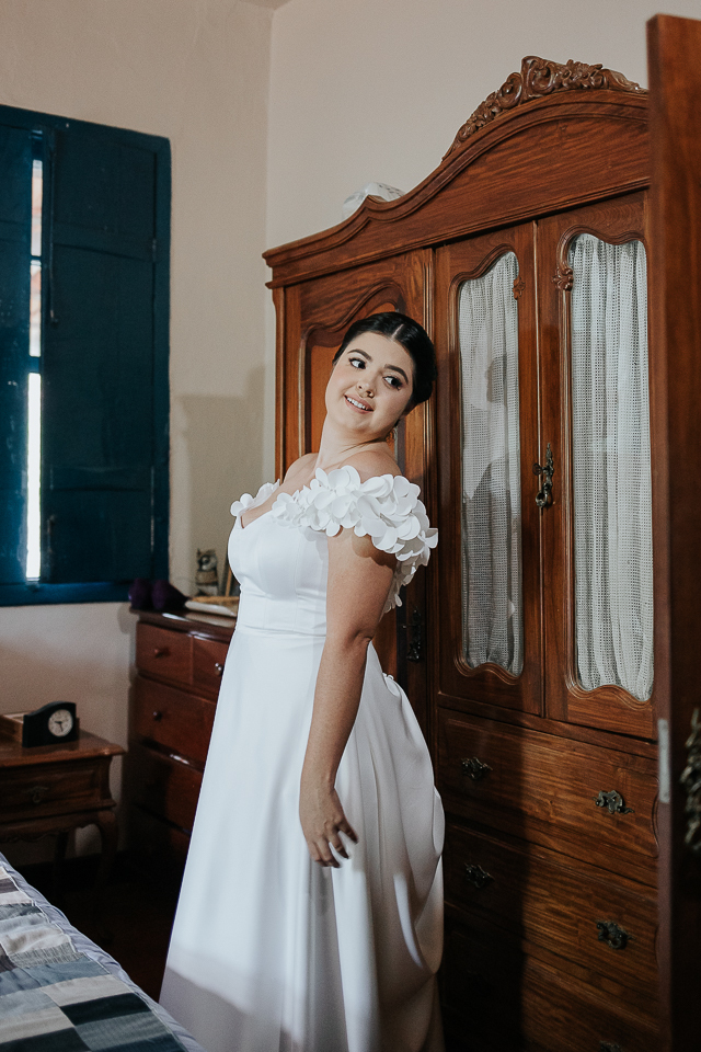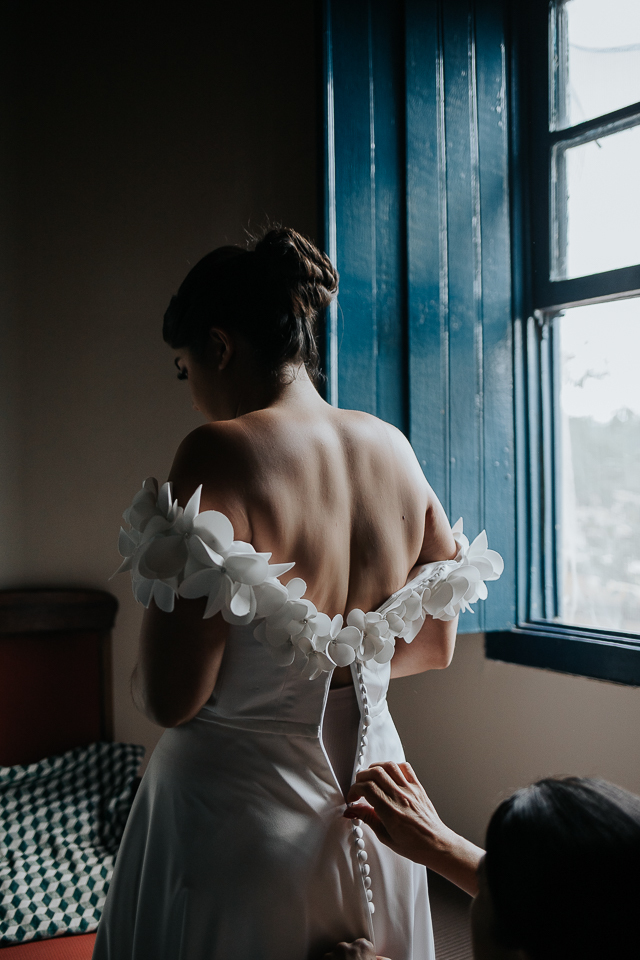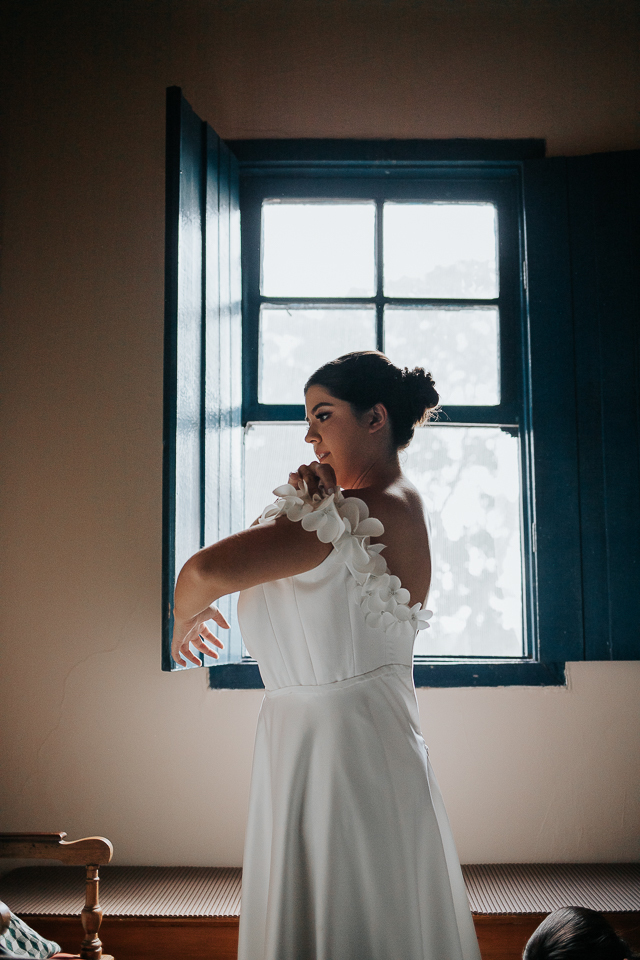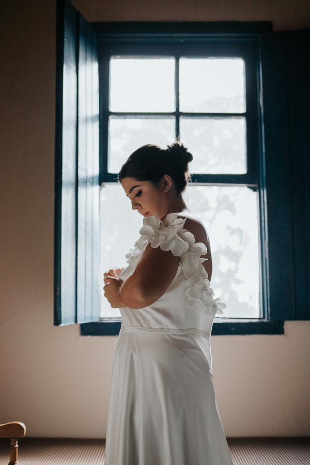 Eu me ofereci pra acompanhá-la ao quarto onde colocaria o vestido e, como acontece naturalmente, as mulheres se entendem em espaços íntimos também, falando a mesma língua do tempo e da poesia. A luz mágica da janela, me oferecida de bandeja pelos deuses, me permitiu fazer retratos bonitos da Mari, de um jeito singelo. Eu já estava completamente satisfeita com esse momento.